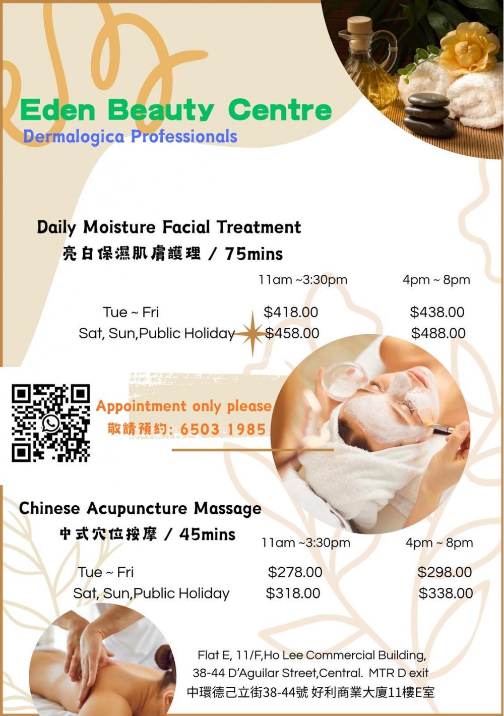 Established in 2008, Eden Beauty Centre located in Central and serve thousands of clients. We understand the needs of unique individuals and customized the most suitable treatments mix for them, including facial treatment, high-end machines, hybrid-style therapy and semi-permanent tattoo and makeup. We aim at serving and building the perfect face, healthy body and mind for our customers.